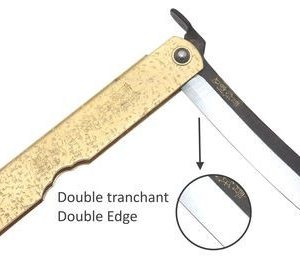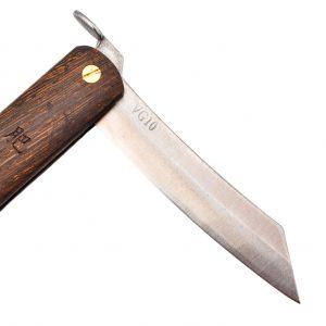 Wenn das Messer neu ist, kann die Klinge etwas gespannt sein, wird sich aber mit der Zeit lockern. Wenn er zu locker wird, kann er durch Hämmern auf den Zapfen gestrafft werden – ein großes Merkmal des Higonokami-Messers.