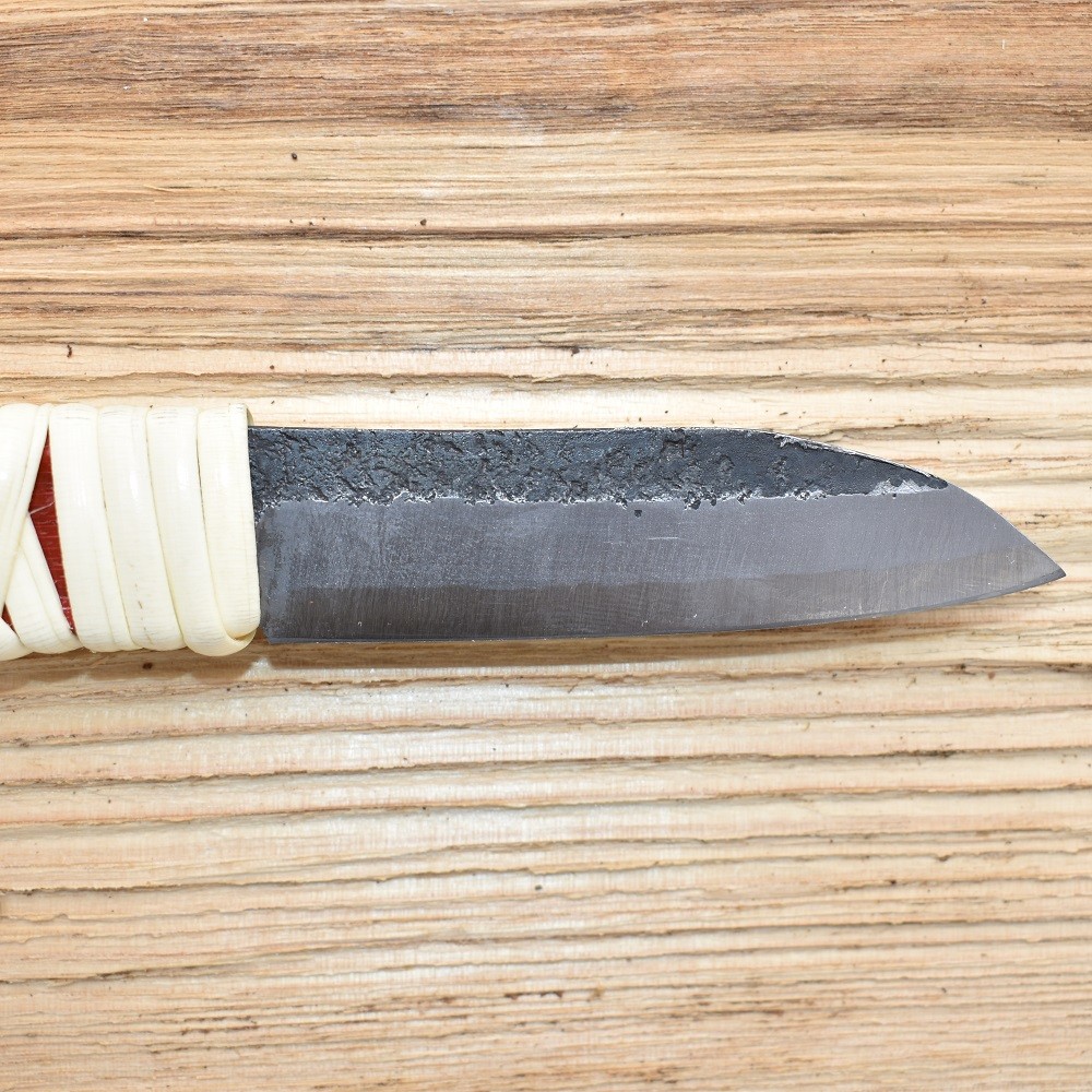 Dieses beidseitig geschärfte Messer wird von den Meistern Motosuke Nagao vollständig von Hand geschmiedet.
