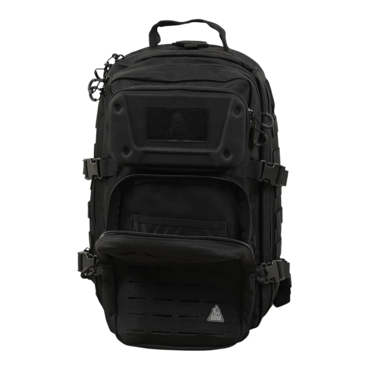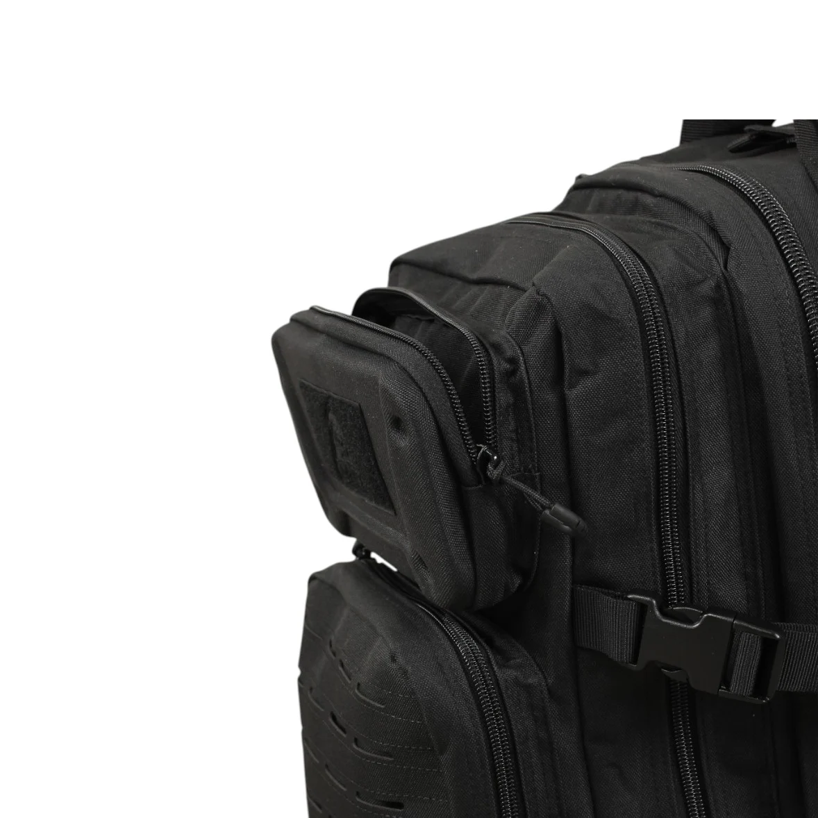 Two large main compartments offer structured organization, with a specialized sub-compartment for laptops. The front features two separate pockets: one equipped with the Molle laser-cut system for attaching customizable modular tactical pouches, the other with a hard shell to protect sensitive small equipment (phone, GPS, glasses). This tactical backpack adapts to your specific needs without structural modification.
