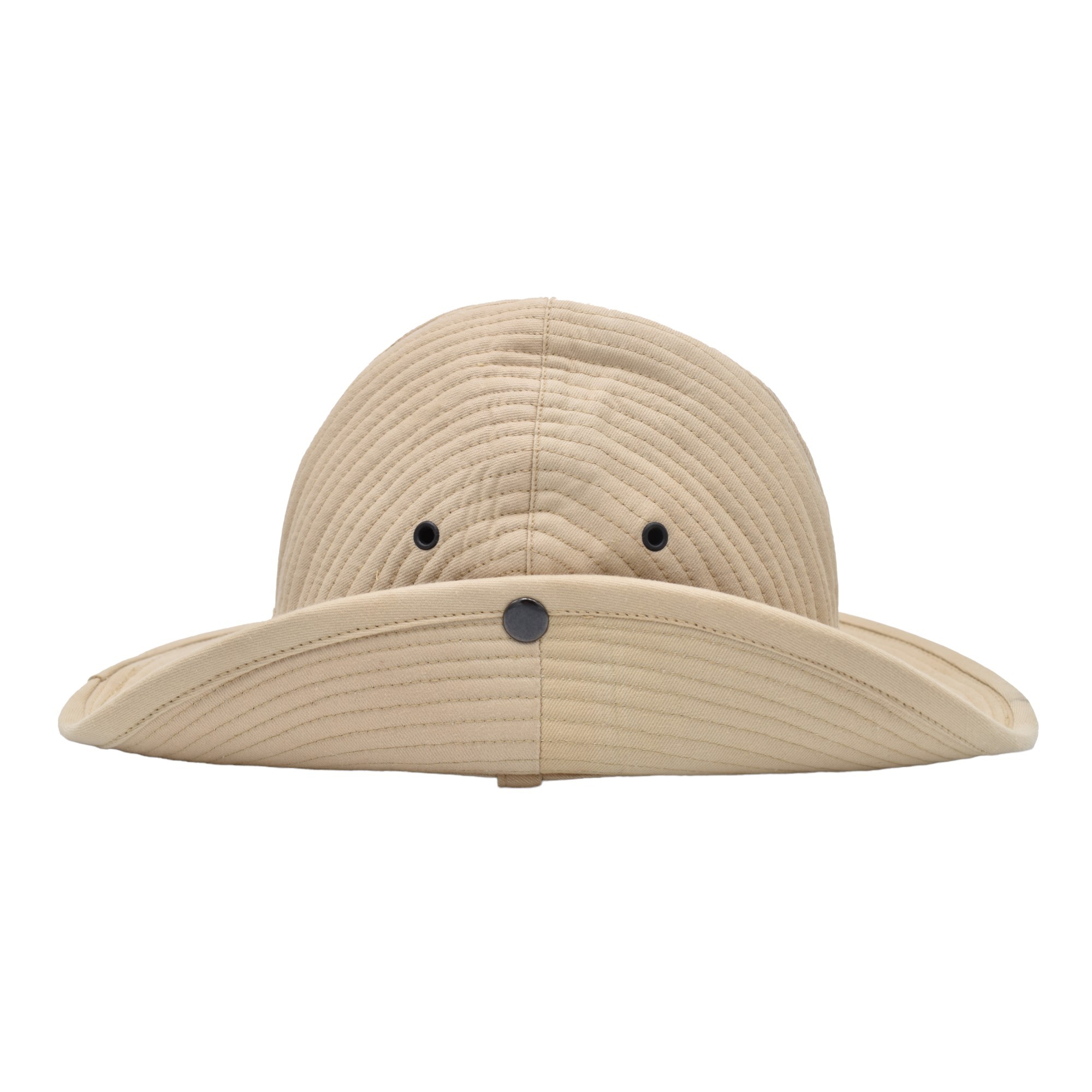 The cap is made up of four pieces assembled with semicircular stitching to provide a degree of rigidity. The bottom and brim of the hat are covered with a cotton twill band.