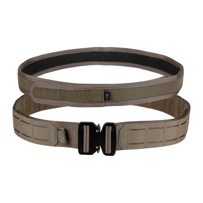 Conjunto de cinturón táctico MOLLE de poliéster de alta resistencia. El sistema rápido dúo combina un cinturón interior de 4 cm de ancho con un cinturón exterior de 5 cm. El cierre autoadherente del cinturón interior permite colocar y retirar el cinturón exterior de forma rápida y eficaz para un equipamiento modular y profesional.