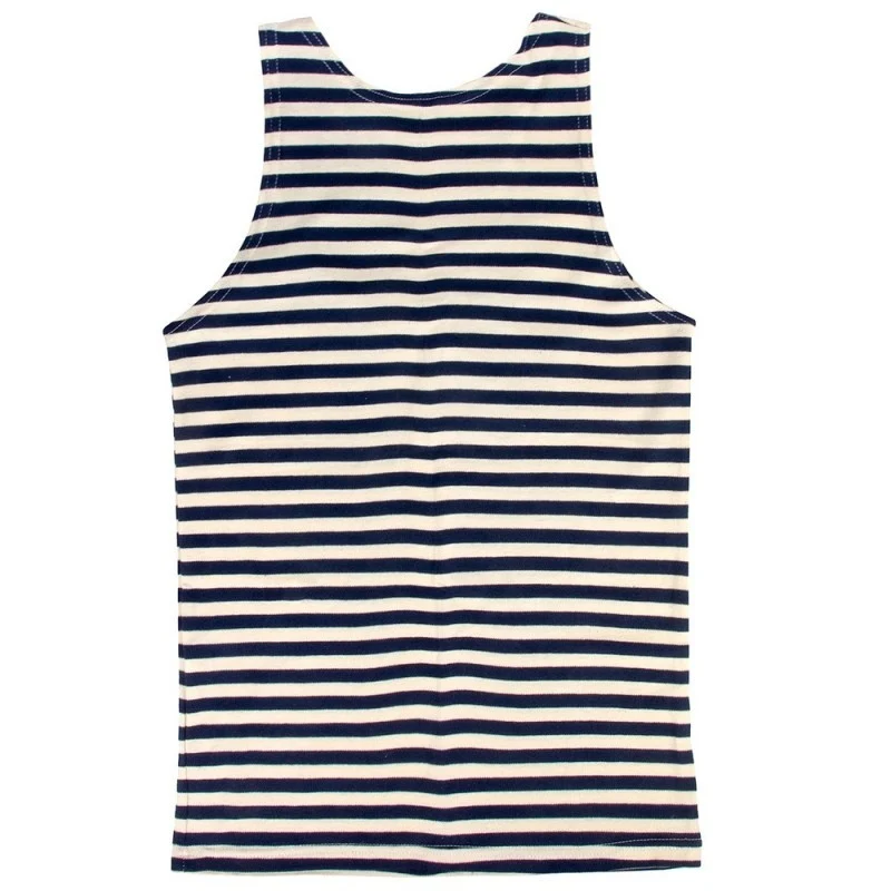 ロシア海軍部隊の服装に着想を得たこのテルニャーシカ・タンクトップは、ネイビーブルーとエクリュのストライプの伝統的なルックと、アウトドア用にデザインされたソリッドな構造が組み合わされている。241g/m²の無漂白天然コットン素材は夏でも涼しく、オリジナルに忠実なヴィンテージ感を保ちます。