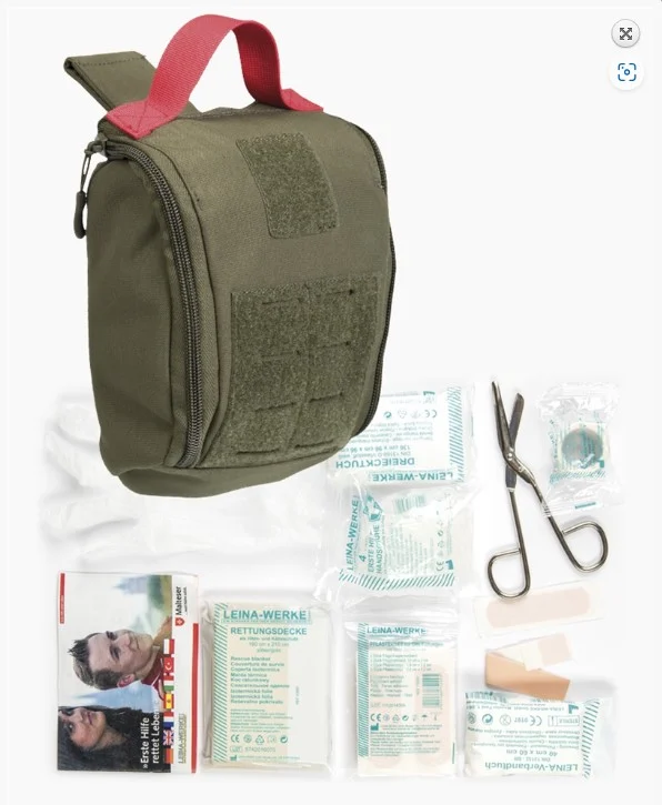 (4x 救急用包帯 10 x 6 cm、2x 指先用包帯 12 x 2 cm、2x ドレッシングストリップ 1.9 x 7.2 cm、4x ドレッシングストリップ 2.5 x 7.2 cm) – 滅菌包帯 40 x 60 cm – 救急用手袋 2 組 – 救急用説明書 –救急セット ドイツ製– Leina-Werke GmbH