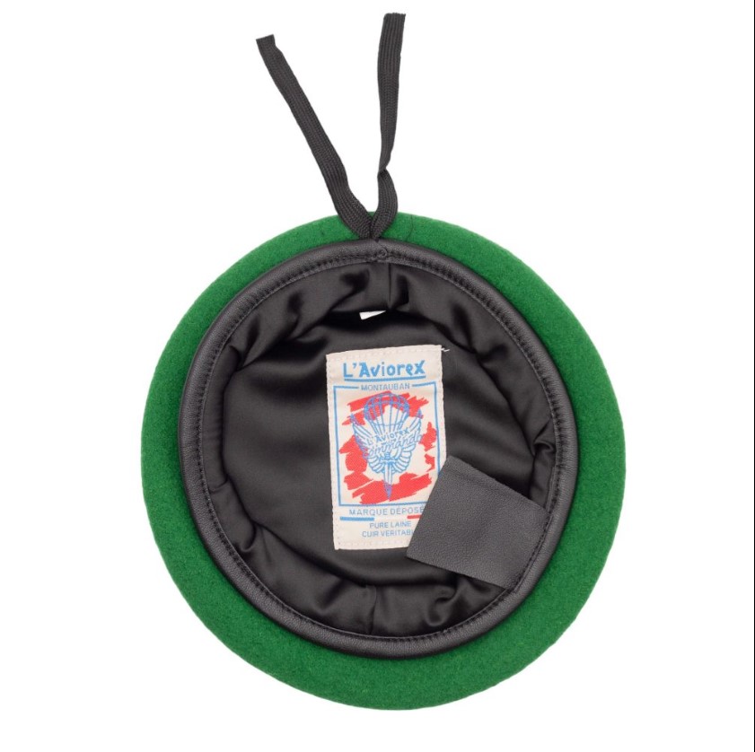 Béret vert L’Aviorex® de qualité militaire : 100% laine vierge, cuir noir et doublure acétate. Modèle commando de légion étrangère. Livré sans insigne.