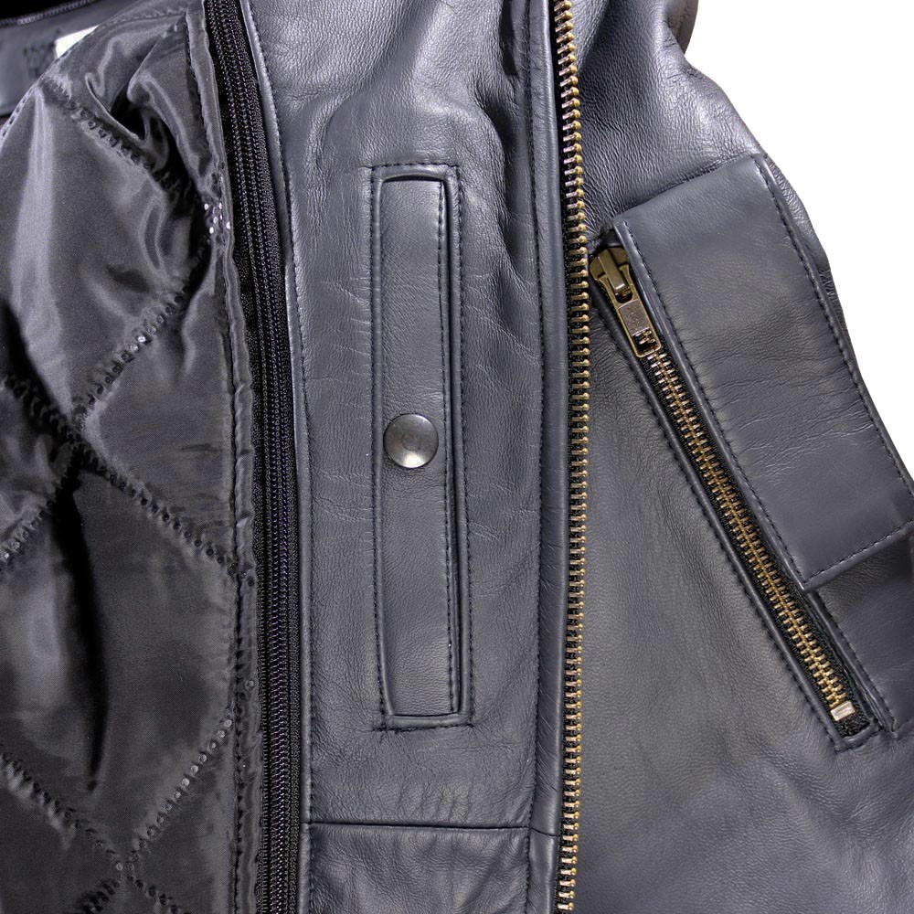 Le cuir d’agneau premier choix est proposé en bleu pétrole, mais aussi en variantes marron et noir pour s’adapter à chaque look. Son aspect légèrement vieilli rappelle les blousons aviateurs d’époque tout en restant élégant pour un homme ou une femme.
