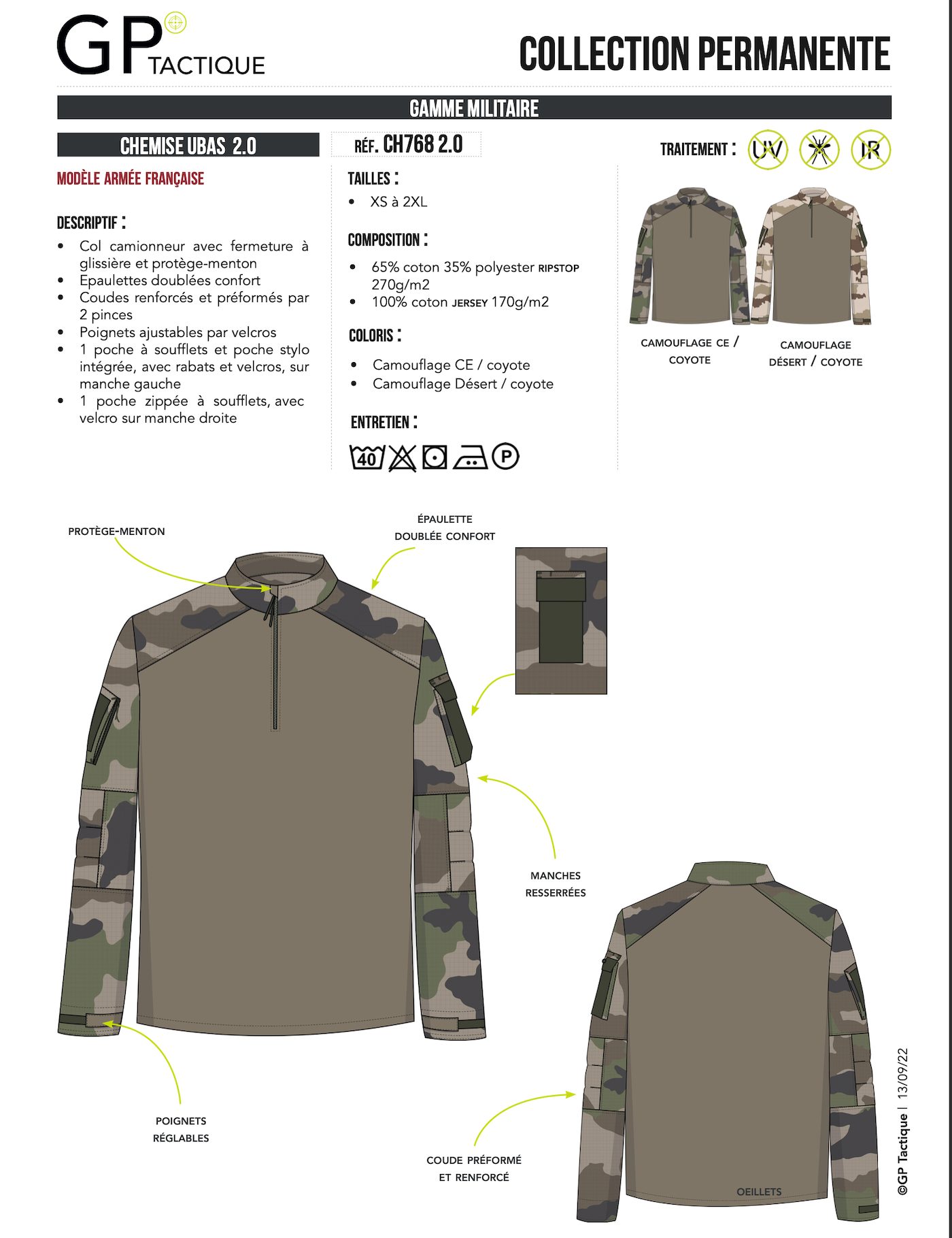 Issue de l’uniforme de l’ armée française, cette chemise ubas militaire allie légèreté et robustesse. Son architecture bi-matière associe un corps en coton coyote respirant et des manches camouflage CE en ripstop pour une résistance exemplaire sur le terrain.